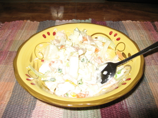 Wegmans買來的冷凍豆子(包括玉米粒、紅蘿蔔丁、青豆、四季豆、毛豆等)煮一下(我懶得煮直接丟到微波爐一分鐘)
